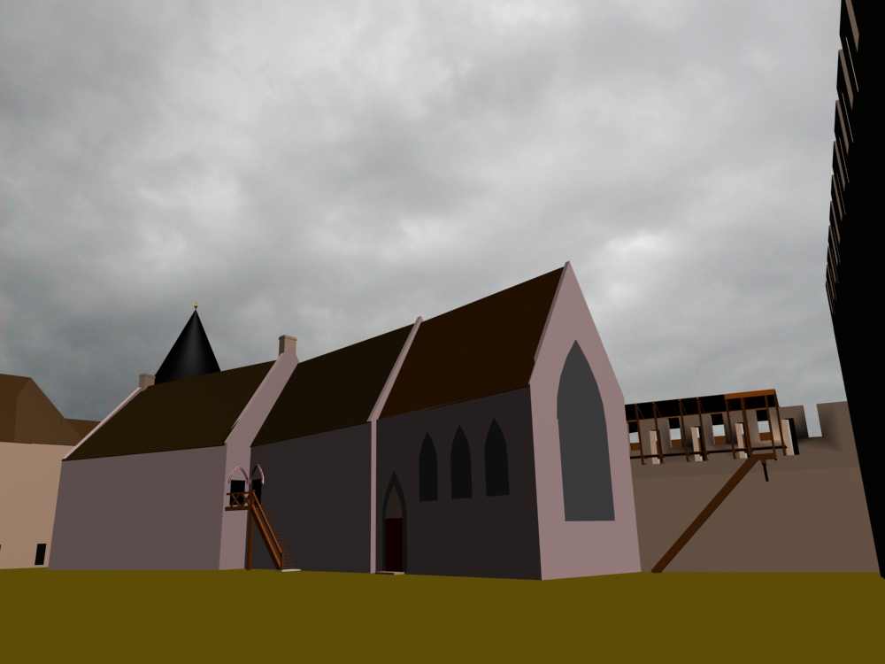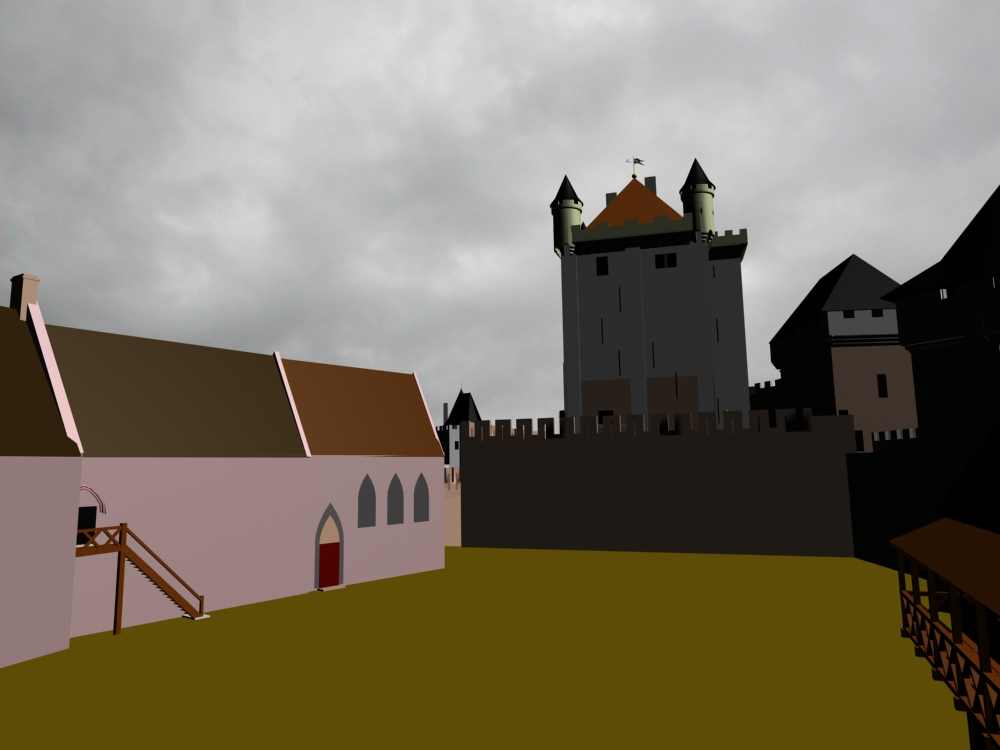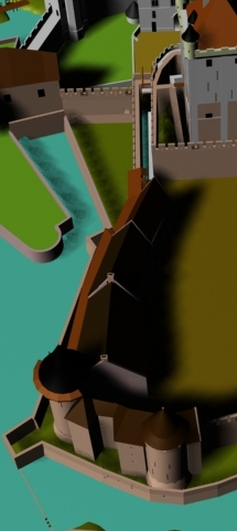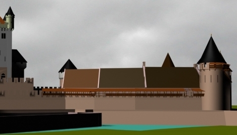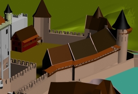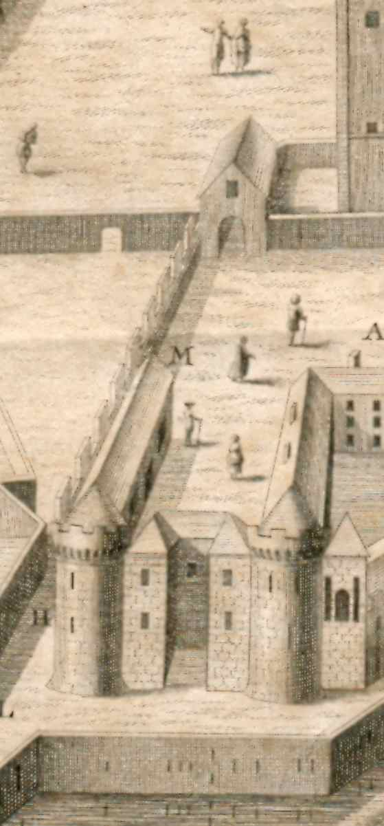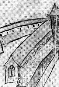 Item ont semblablement fait de leur mestier de charpentier ung pan de hourdeys contenant une perche ou environ, estant ou derriere de la chambre de monsigneur. Item ont fait et rappareillyé les hourdeys d’iceluy chastel depuis la tour de l’orloge jusques a iceluy pan de hourdeys derrainement fait (BNF, fr.26 054, n° 1526, 1431, n.s. 27 mars). (à droite de la chapelle sur la vue 42) : Ung hourdeys en fourme de guerite estant entre le bout de la chapelle dud. chastel et une tourelle estant oud. Chastel en venant a la basse court d’icelluy chastel […] avecquez ung degrey de boys pour descendre dud. Hourdeys ou belle [basse-cour]d’icelluy chastel (BNF, fr.26 087, n° 7581 (1431, avr.-3 mai).