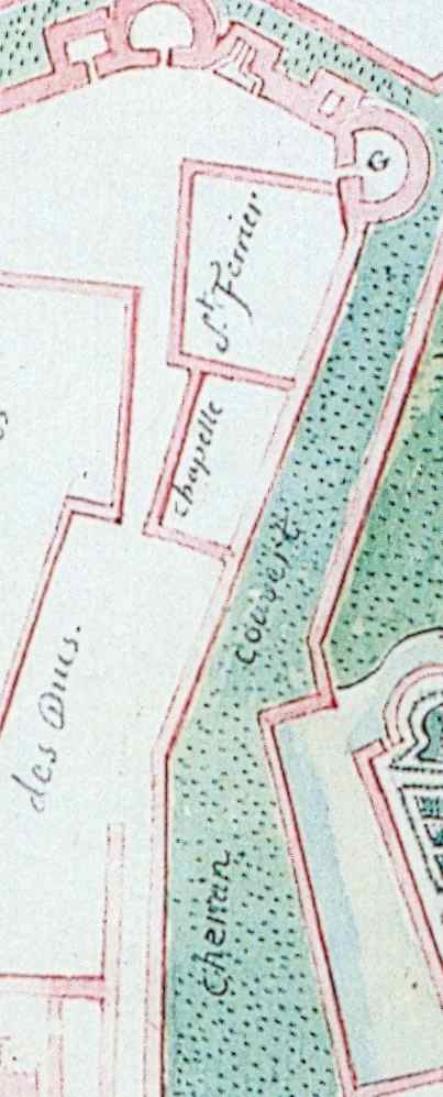 D’après le texte de 1678, sur la main droite en entrant à l’arrière du château, se trouvait une chapelle rectangulaire (48 x 24 pieds ; ou 40 x 20 selon le texte de 1643 ; soit environ 12 à 14,40 m x env. 6 à 7,20 m [les deux auteurs ont pu prendre leurs mesures l’un à l’intérieur, l’autre à l’extérieur]), dont la muraille, du costé de la petite rivière de briante […] sert de closture aud. chasteau. La chapelle castrale d’Alençon est dite pavée de pierre blanche en façon de lozenge [AD Orne, D7 (1643, 9 juin)] ; le pavé qui est de pierre blanche d’environ 9 pouces en carré en tout cassé et usé [AD Orne, D5 (1678, 25 janv.)]